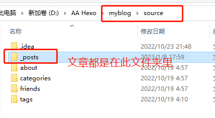 - 创建完每次生成的文章都固定在你的博客根目录下面的 source/_posts 下